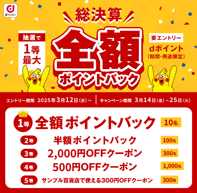 キャンペーン期間の商品代金合計金額からポイント・クーポンご利用額を除いた金額(税込・送料込)に対して、1等全額、2等半額分を、dポイント(期間・用途限定)を進呈することを意味します。