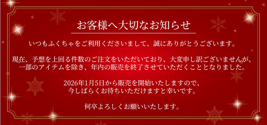 現在、予想を上回る件数のご注文をいただいており、大変申し訳ございませんが、一部のアイテムを除き、年内の販売を終了させていただくこととなりました。