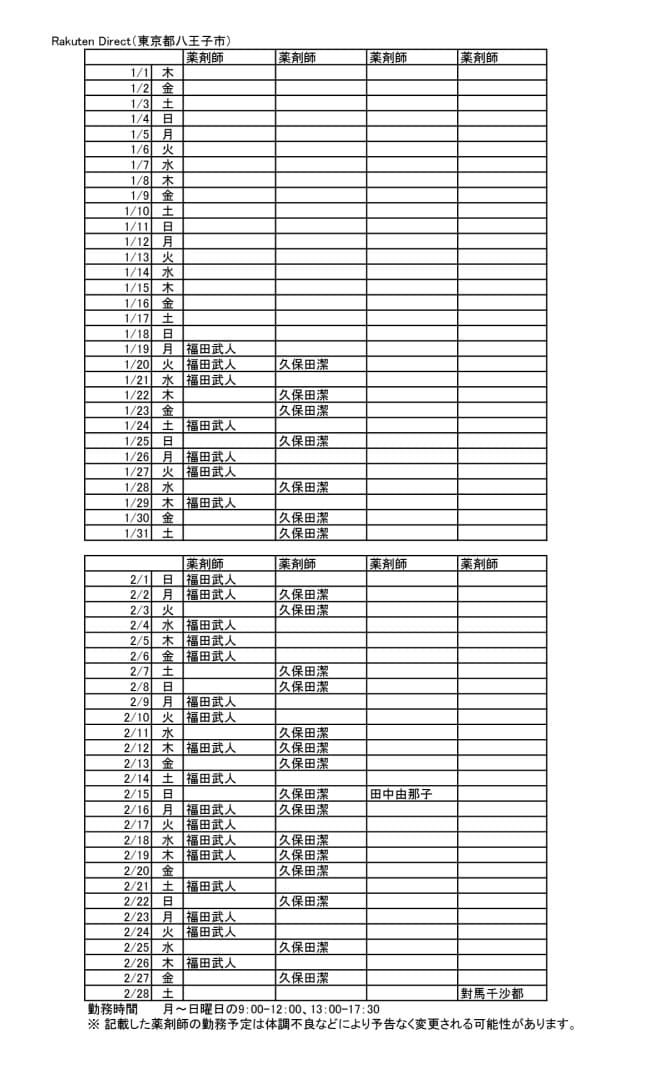 管理薬剤師 : 久保田潔(登録番号:424119) 主な業務内容: (1)従業員の監督 (2)医薬品等の管理 (3)適正な使用のための「情報提供」業務 薬剤師 : 福田武人(登録番号:451582) 主な業務内容: (1)従業員の監督 (2)医薬品等の管理 (3)適正な使用のための「情報提供」業務 薬剤師:田中由那子(登録番号:387233) 主な業務内容: (1)従業員の監督 (2)医薬品等の管理 (3)適正な使用のための「情報提供」業務 薬剤師:對馬千沙都(登録番号:503720) 主な業務内容: (1)従業員の監督 (2)医薬品等の管理 (3)適正な使用のための「情報提供」業務 上記の薬剤師上記の薬剤師及び登録販売者は名札を着用して業務しております。 |