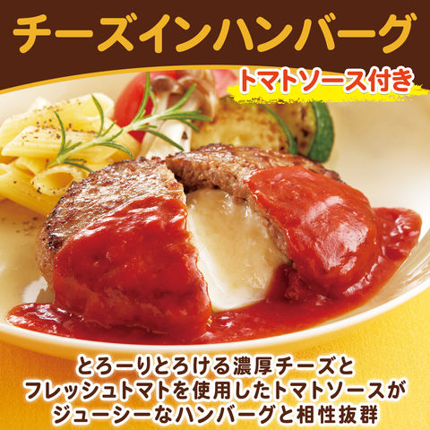 ジョイフルのハンバーグ(てりやきソースペッパー付)×1個、ジョイフルのチーズインハンバーグ(トマトソース付)×1個、ジョイフルのチーズインハンバーグ(デミグラスソース付)×1個