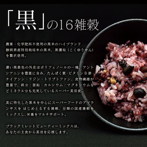 美に特化した黒米を中心にスーパーフードのアマランサスを はじめとるする雑穀、豆類の国産雑穀を ミックスし、栄養をマルチサポート。