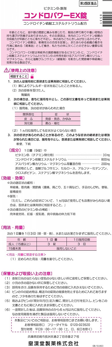 ●コンドロパワーEX錠は神経系の調節機能があるビタミンB1に、コンドロイチン硫酸ナトリウムとビタミンB1の作用を助けけるアスパラギン酸カリウム、マグネシウム、さらに塩酸グルコサミン(緩衝剤)を配合した関節痛や神経痛に効果がある製品です。