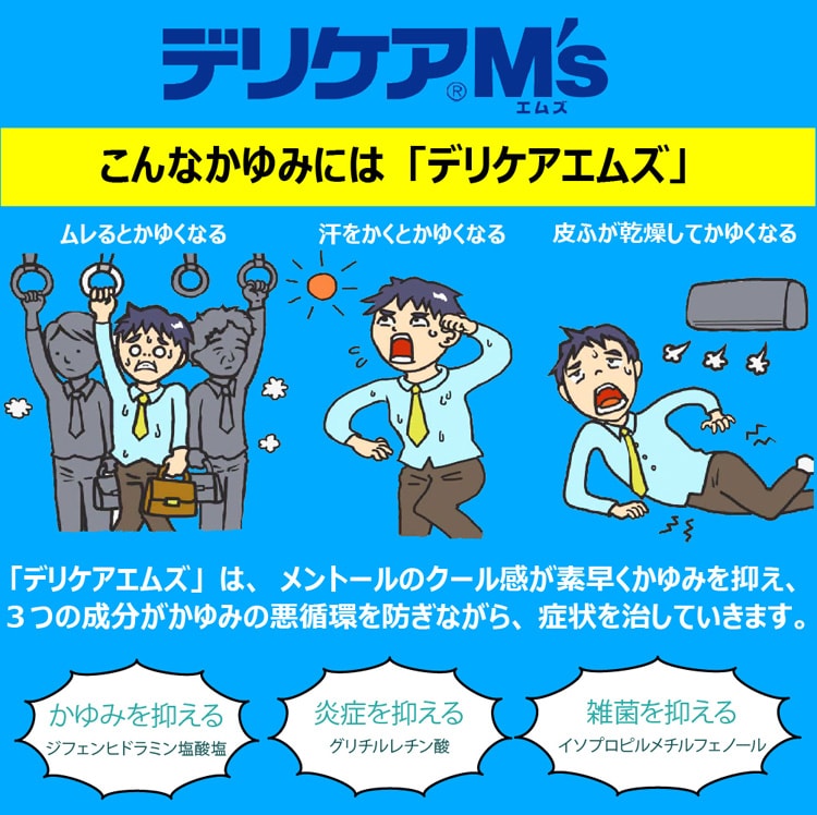 ●デリケアエムズは、デリケートエリアのかゆみを考えて開発された治療薬です。スッキリとしたクール感が、かゆみ感覚をすばやく鎮め、3つの特長(かゆみを止める、炎症を鎮める、雑菌を抑える)で、悪化の要因となるかゆみの悪循環を抑えます。汗やムレの多いデリケートエリアに適したサラッとべたつかないクリームタイプです。