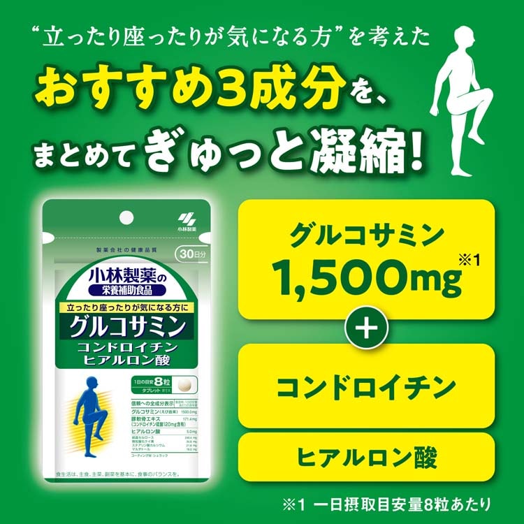 ●小林製薬の「グルコサミン コンドロイチン ヒアルロン酸」は、毎日の立ち座りが気になる方におすすめのサプリです。