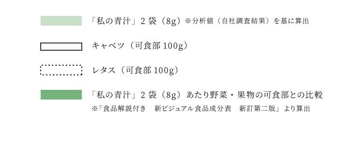 | 2袋(8g)当たり 熱量:24kcal、たんぱく質:1.0g、脂質:0.2g、炭水化物:5.8gー糖質:3.2gー食物繊維:2.6g、食塩相当量:0.09g、ビタミンK:90μg、葉酸:41μg、鉄:0.6mg、カルシウム:14mg、カリウム:253mg、マグネシウム:7mg β-カロテン:647μg、ポリフェノール:41mg、ルテイン:1.3mg、カフェイン:0g |