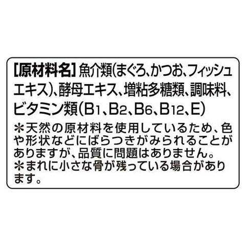 | 魚介類(まぐろ、かつお、フィッシュエキス)、酵母エキス、増粘多糖類、調味料、ビタミン類(B1、B2、B6、B12、E)×天然の原材料を使用しているため、色や形状などにばらつきがみられることがありますが、品質に問題はありません。×まれに小さな骨が残っている場合があります。 |
