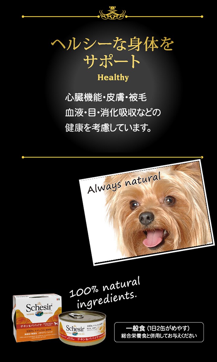 | チキンフィレ50%、ビーフフィレ4%、米1.3%、ビタミンA 1650IU、ビタミンD 3180IU、ビタミンE 10mg |