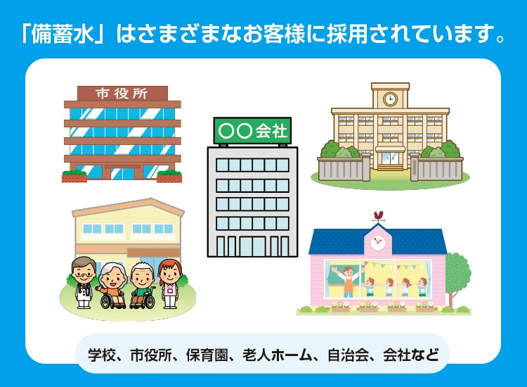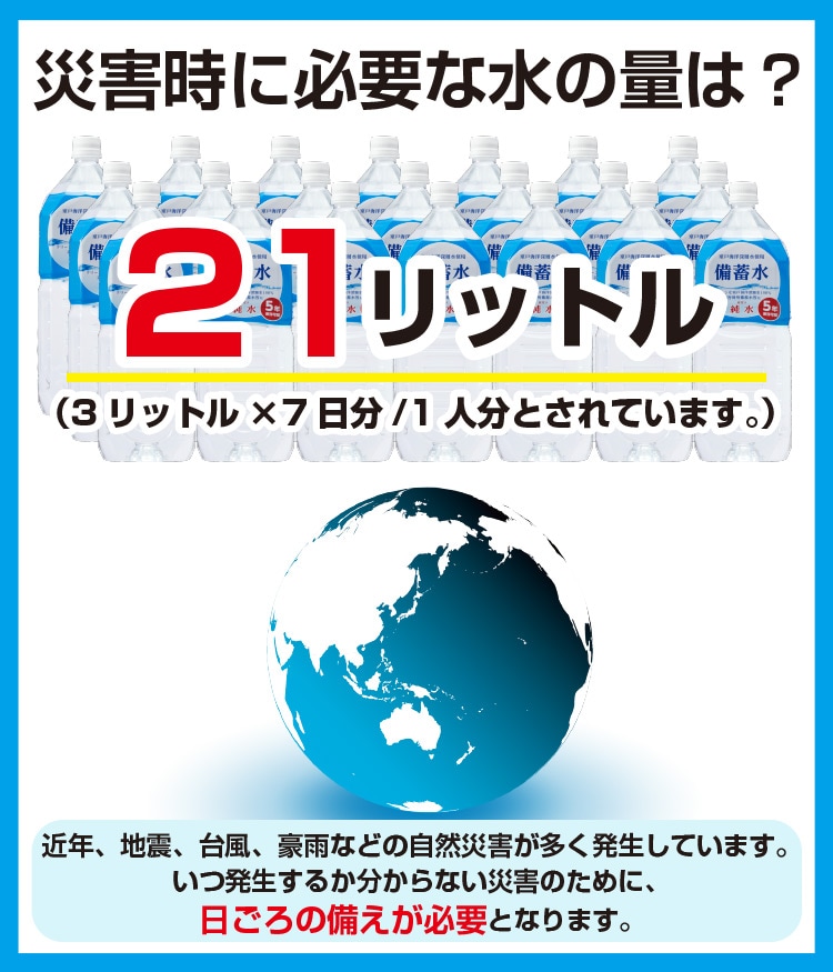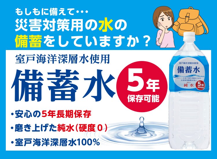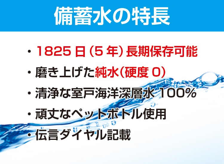 加熱殺菌した水を耐熱ボトルにホット充填することで、長期保存を可能にしました。