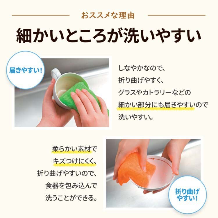 ●スポンジより洗浄力が大きく、こびりつきや油汚れを落とします。