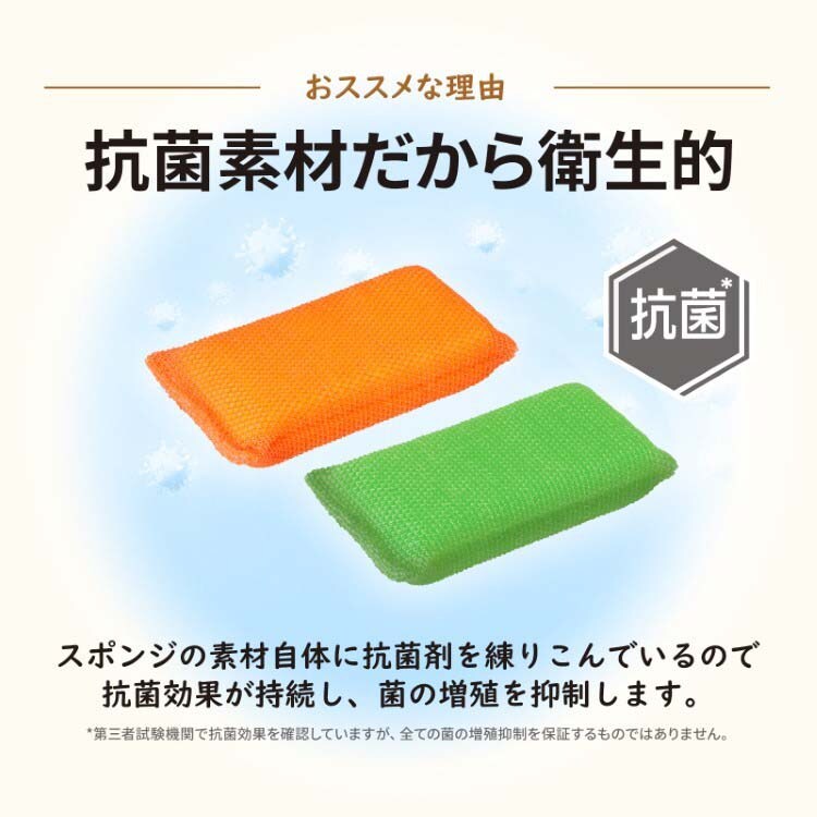 ●スポンジ素材自体に抗菌剤を練りこんでいるので、抗菌効果が持続します。ウレタンスポンジには無機系(銀・亜鉛系)抗菌剤、セルローズスポンジには有機系(亜鉛系)抗菌剤を使用しています。