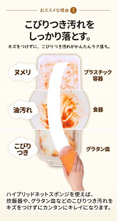 ●スポンジより洗浄力が大きく、こびりつきや油汚れを落とします。
