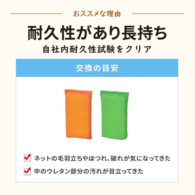 ●スポンジ素材自体に抗菌剤を練りこんでいるので、抗菌効果が持続します。ウレタンスポンジには無機系(銀・亜鉛系)抗菌剤、セルローズスポンジには有機系(亜鉛系)抗菌剤を使用しています。