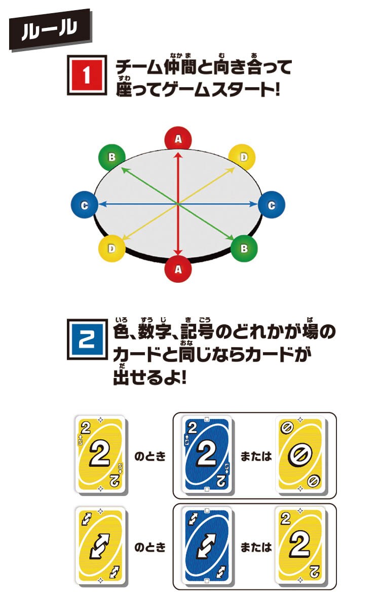 ●特別なカードとルールでチームメイトが協力し合いますが、勝つためには両プレイヤーとも手札をすべて捨てなければなりません。