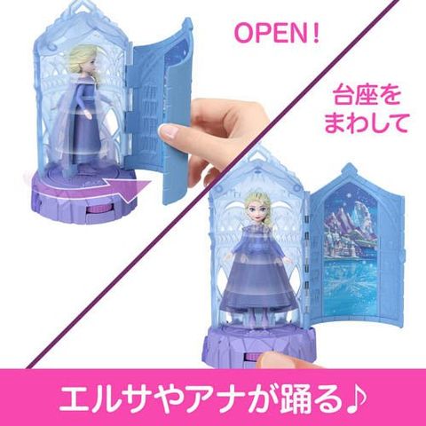 ●こおりをモチーフにしたダンスホールにドールを設置してドアを開け閉めすると、中でエルサやアナがかわいくダンスします。