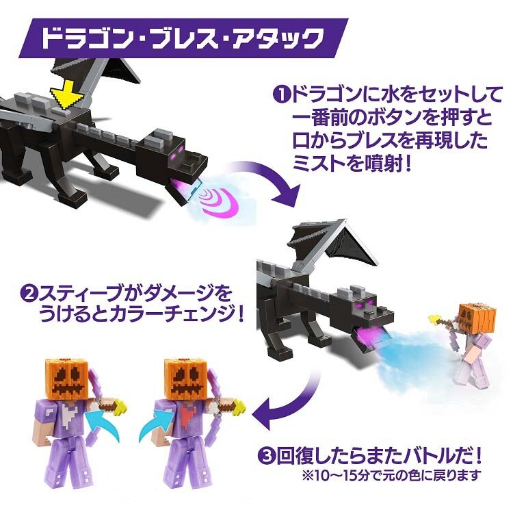 ●ドラゴンのブレスを再現したミスト噴射で、付属のスティーブフィギュアにバトルダメージ表現が現れるギミック付き。