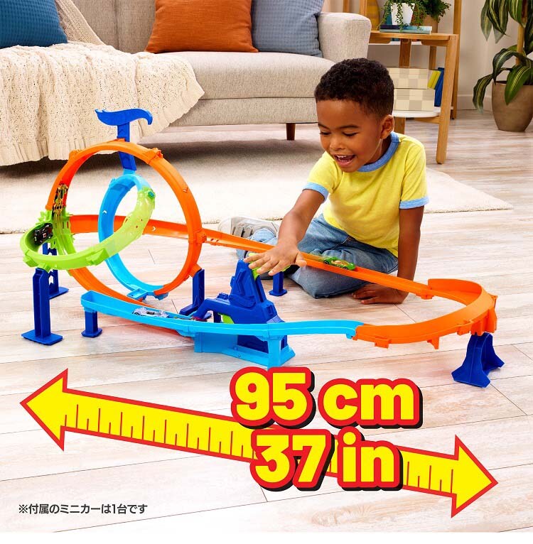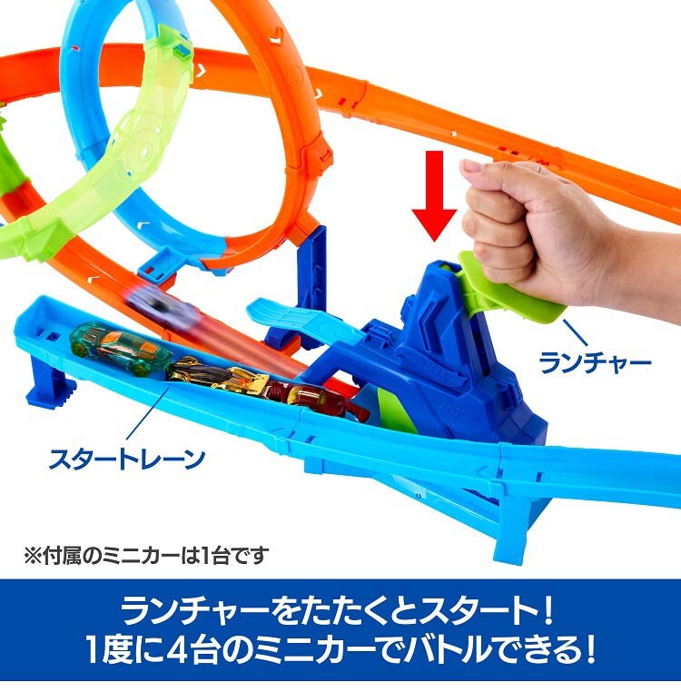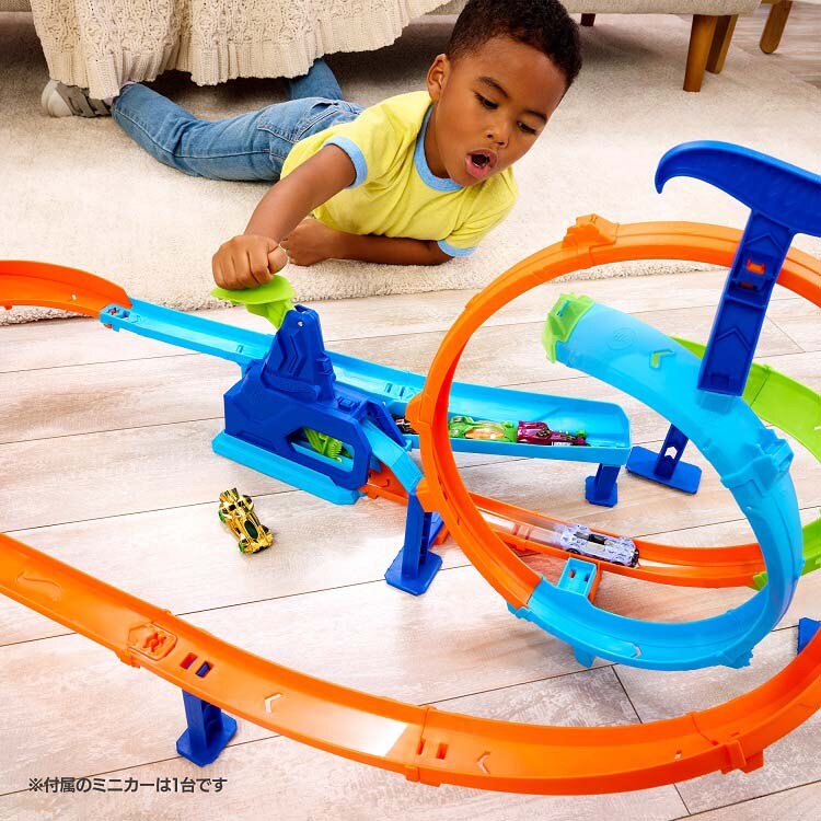 ●180度カーブでスタート地点に戻る設計で、繰り返しスタントに挑戦可能。複数台を同時に走らせることで、迫力あるレースやクラッシュのドキドキが楽しめます。(セットにはミニカー1台のみ付属します)