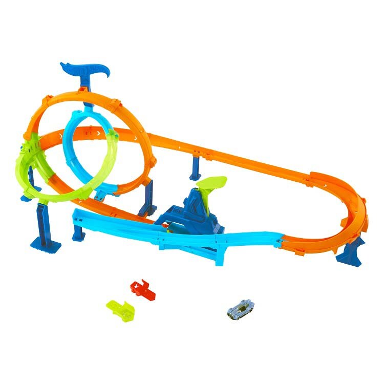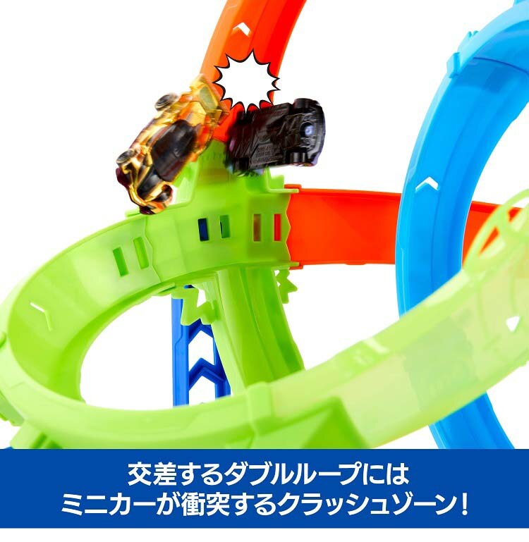 ●2つの交差するダブルループを次々と駆け抜け、クラッシュゾーンを回避しよう。最大4台のミニカーを同時に走らせることができる、スピード感あふれるスタントプレイセットです。