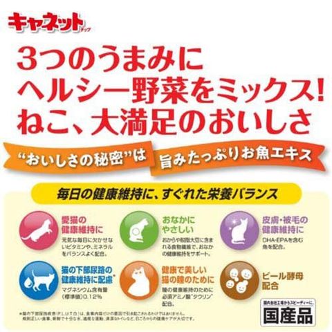 | 穀類(とうもろこし、コーングルテンミール、等)、肉類(チキンミール、ミートミール、ささみパウダー、チキンレバーパウダー、等)、豆類(おから、脱脂大豆、等)、油脂類(動物性油脂、等)、魚介類(フィッシュミール:DHA・EPA源、フィッシュエキス、かつおエキス、しらすエキス、等)、ビール酵母、野菜類、ビタミン類(A、D3、E、K3、B1、B2、パントテン酸、ナイアシン、B6、葉酸、ビオチン、B12、コリン、イノシトール)、ミネラル類(カルシウム、リン、ナトリウム、カリウム、塩素、鉄、コバルト、銅、マンガン、亜鉛、ヨウ素)、アミノ酸類(メチオニン、タウリン)、着色料(赤102)、酸化防止剤(ローズマリー抽出物、ミックストコフェロール) |
