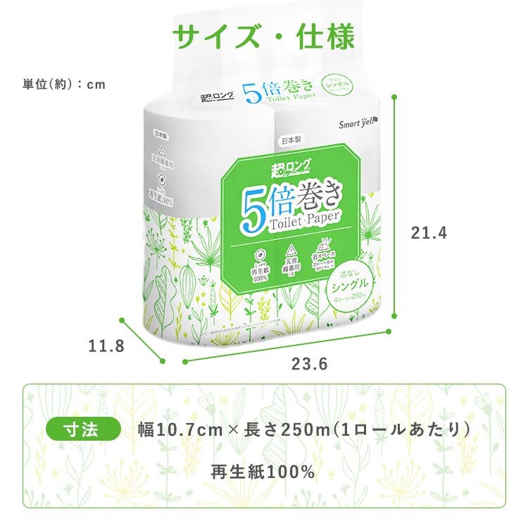 トイレットペーパー シングル 5倍巻 芯なし 再生紙 (4ロール)