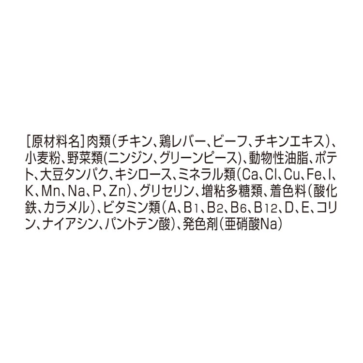 | 肉類(チキン、鶏レバー、ビーフ、チキンエキス)、小麦粉、野菜類(ニンジン、グリーンピース)、動物性油脂、ポテト、大豆タンパク、キシロース、ミネラル類(Ca、Cl、Cu、Fe、I、K、Mn、Na、P、Zn)、グリセリン、増粘多糖類、着色料(酸化鉄、カラメル)、ビタミン類(A、B1、B2、B6、B12、D、E、コリン、ナイアシン、パントテン酸)、発色剤(亜硝酸Na) |