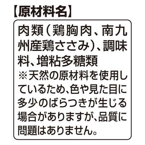| 肉類(鶏胸肉、南九州産鶏ささみ)、調味料、増粘多糖類 ※天然の原材料を使用しているため、色や見た目に多少のばらつきが生じる場合がありますが、品質に問題はありません。 |