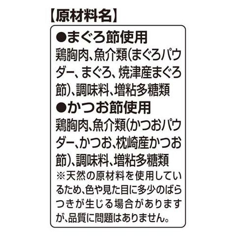 | ・まぐろ節使用:鶏胸肉、魚介類(まぐろパウダー、まぐろ、焼津産まぐろ節)、調味料、増粘多糖類・かつお節使用:鶏胸肉、魚介類(かつおパウダー、かつお、枕崎産かつお節)、調味料、増粘多糖類※天然の原材料を使用しているため、色や見た目に多少のばらつきが生じる場合がありますが、品質に問題はありません。 |