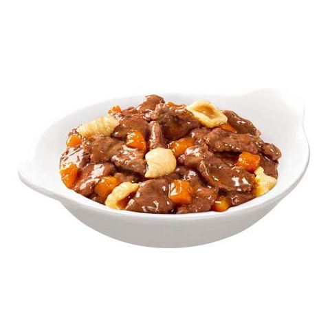 ●厳選されたビーフに、緑黄色野菜とパスタを合わせておいしく丁寧に調理した成犬用のドッグフードです。