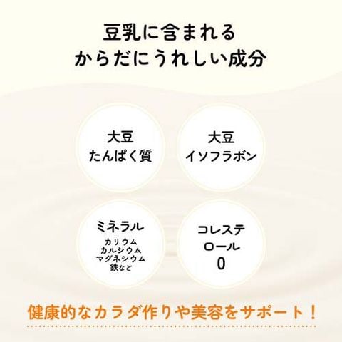 | 1パック(200ml)当たり エネルギー:103Kcal、たんぱく質:8.0g、脂質:5.9g(飽和脂肪酸:0.7g)、コレステロール:0mg、炭水化物:4.5g、食塩相当:0.4g、亜鉛、0.9mg、カリウム::415mg、カルシウム::27mg、鉄::1.0mg、マグネシウム::50mg、イソフラボン:84mg |