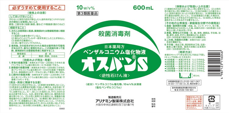 | 成分: ベンザルコニウム塩化物、10w/v%水溶液 (塩化ベンザルコニウム) |