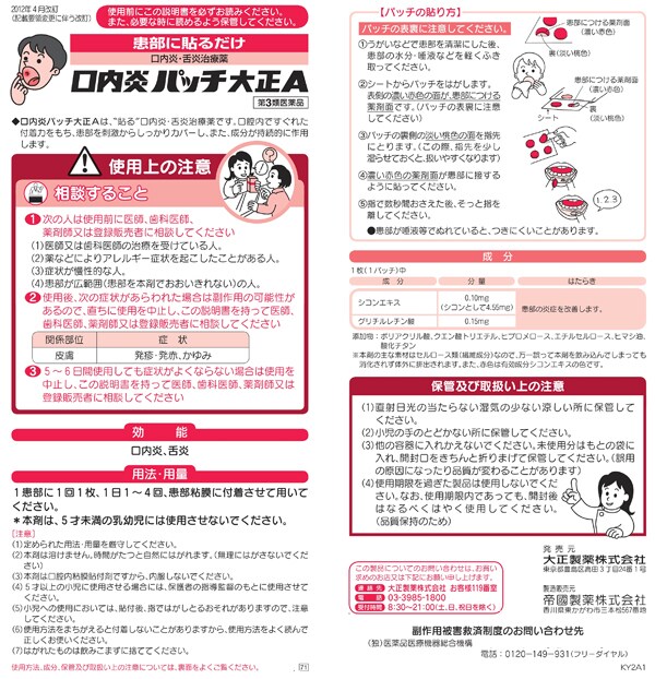 ●口内炎パッチ大正Aは、パッチタイプの「貼る」口内炎・舌炎治療薬です。患部を刺激からしっかりカバーし、有効成分がだ液で流れず、口腔内ですぐれた付着力をもつため、効果的な治療ができます。