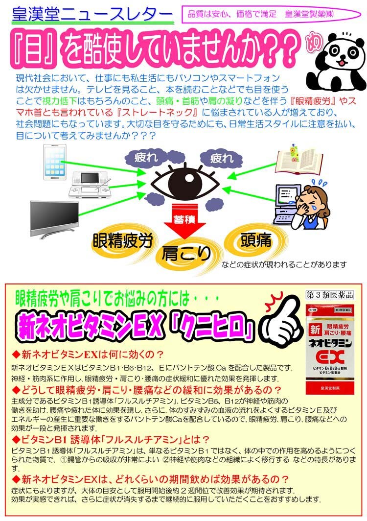 ●新ネオビタミンEX「クニヒロ」は、ビタミンB1誘導体であるフルスルチアミン塩酸塩、ビタミンB6、ビタミンB12といったビタミンB群に、パントテン酸カルシウム、ビタミンE、ガンマ-オリザノールを配合した製品です。