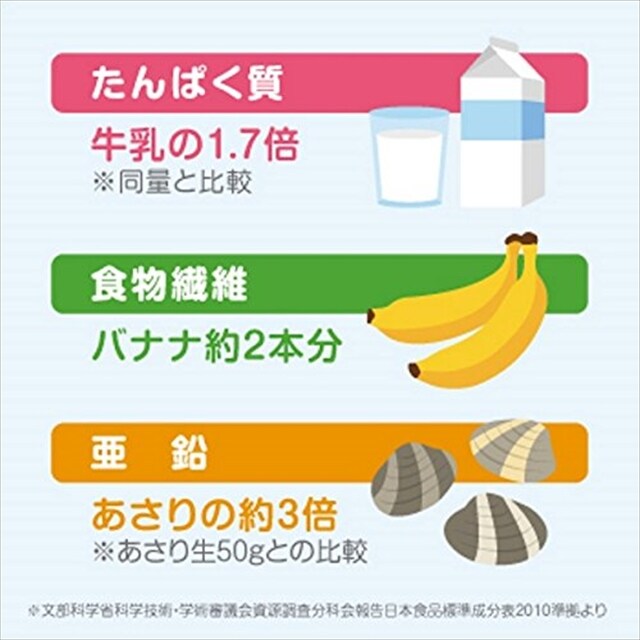 | 1本(125ml)当たり エネルギー:200kcal、たんぱく質:7.5g、脂質:5.6g、炭水化物:31.8g、糖質:29.3g、食物繊維:2.5g、食塩相当量:0.33g、亜鉛:2.0mg、カリウム:180mg、カルシウム:120mg、クロム:6.0μg、セレン:12μg、鉄:1.5mg、銅:0.10mg、マグネシウム:40mg、マンガン:0.46mg、モリブデン:10μg、ヨウ素:30μg、リン:140mg、ナイアシン:5.5mg、パントテン酸:1.2mg、ビオチン:30μg、ビタミンA:120μg、ビタミンB1:0.30mg、ビタミンB2:0.40mg、ビタミンB6:0.60mg、ビタミンB12:1.2μg、ビタミンC:100mg、ビタミンD:1.2μg、ビタミンE:6.0mg、ビタミンK:18.8μg、葉酸:60μg 塩素:120mg、水分:93.9g |