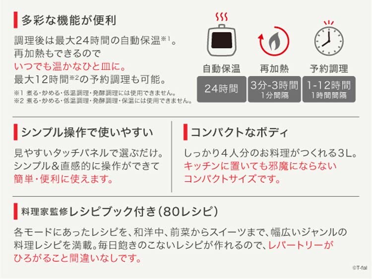 ●無水、発酵調理が加わり、時短料理から本格料理まで幅広い料理がつくれる1台12役。