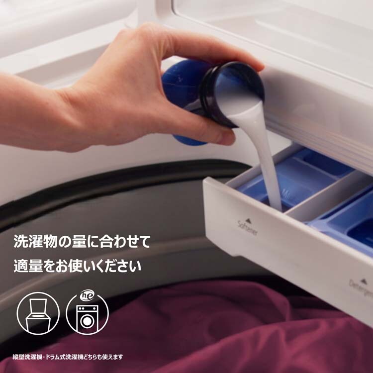 ・使用量の目安:水65L(洗濯物量の目安6.0kg)に対してキャップ内の一番下の線まで(約20ml)を注ぎ、最後のすすぎのときに入れてください。