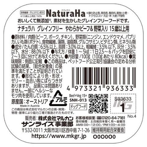 ナチュラハ グレインフリー やわらかビーフ&野菜入り 15歳以上用 (100g*48コセット)