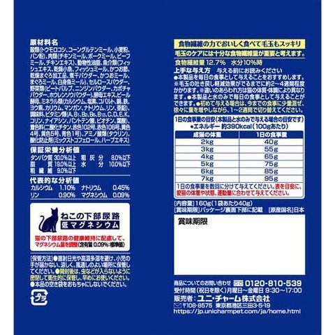 | 穀類(トウモロコシ、コーングルテンミール、小麦粉、パン粉)、肉類(チキンミール、ポークミール、ビーフミール、チキンエキス)、動物性油脂、魚介類(フィッシュエキス、乾燥小魚、フィッシュミール、かつお節、乾燥まぐろ加工品、煮干パウダー、かつおミール、まぐろミール、白身魚ミール)、セルロースパウダー、野菜類(ビートパルプ、ニンジンパウダー、カボチャパウダー、ホウレンソウパウダー)、酵母エキス、ビール酵母、ミネラル類(カルシウム、塩素、コバルト、銅、鉄、ヨウ素、カリウム、マンガン、ナトリウム、リン、亜鉛)、調味料、ビタミン類(A、B1、B2、B6、B12、C、D、E、K、コリン、ナイアシン、パントテン酸、ビオチン、葉酸)、着色料(二酸化チタン、赤色102号、赤色106号、黄色4号、黄色5号、青色1号)、アミノ酸類(タウリン)、酸化防止剤(ミックストコフェロール、ハーブエキス) |