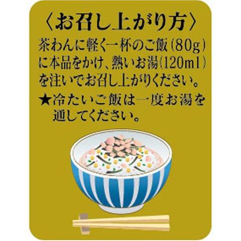 茶わんに軽く一杯のご飯(80g)に本品をかけ、熱いお湯(120mL)を注いでお召し上がりください。