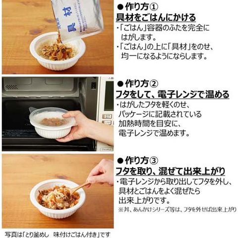 ・電子レンジで温める場合、ごはん容器のフタを完全にはがさずに加熱すると、容器が破裂する恐れがありますので避けてください。