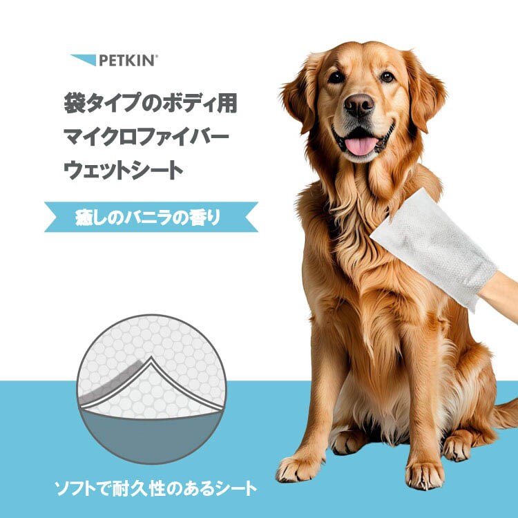 ・シートの袋に手をいれてペットの身体を拭きます。マイクロファイバーウェットシートで汚れが簡単に拭き取れます。