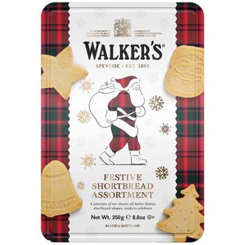 ●クリスマスの雰囲気を盛り立てる缶にツリー、サンタ、星、ベルの形をしたショートブレッドが入っています。