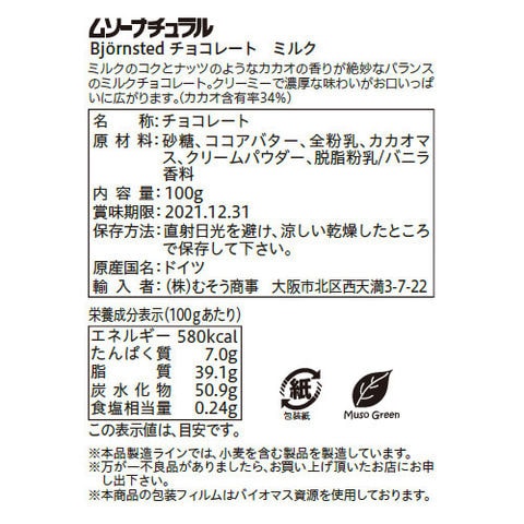 | 100g当たり エネルギー:580kcal、たんぱく質:7.0g、脂質:39.1g、炭水化物:50.9g、食塩相当量:0.24g ※この表示値は目安です。 |