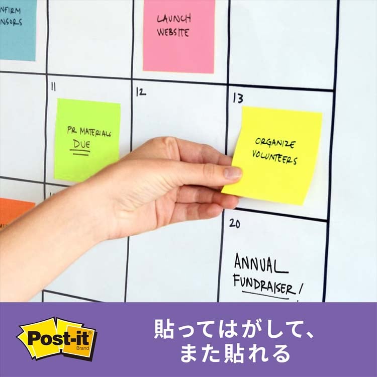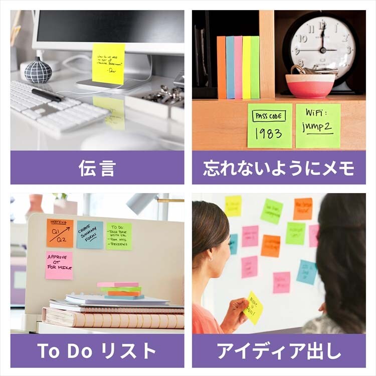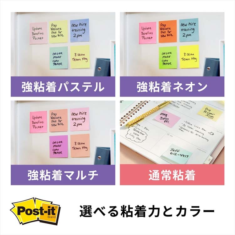 ●強粘着タイプのポスト・イット(R)ノートです。パソコンのデスクトップやキャビネット、樹脂製品などつきにくかった場所にしっかり貼れます。