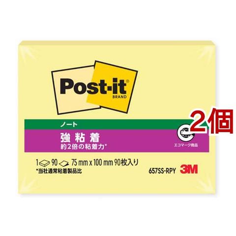 3M ポスト イット 付箋 強粘着 ノート 75mm*100mm イエロー 657SS-RPY (90枚入*2コセット)