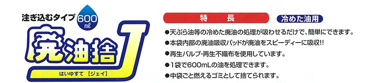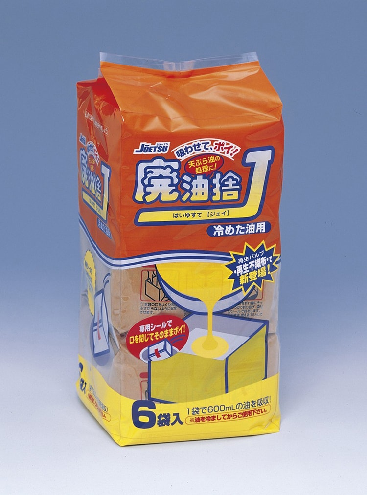 ●「廃油捨」シリーズは、1袋で約600mLの油を処理できる廃油処理剤です。