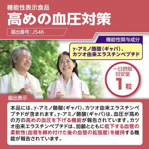 届出表示:本品には、γ-アミノ酪酸(ギャバ)、カツオ由来エラスチンペプチドが含まれます。γ-アミノ酪酸(ギャバ)は、血圧が高めの方の高めの血圧を下げる機能が報告されています。カツオ由来エラスチンペプチドは、加齢とともに低下する血管の柔軟性(血管を締め付けた後の血管の拡張度)を維持する機能が報告されています。