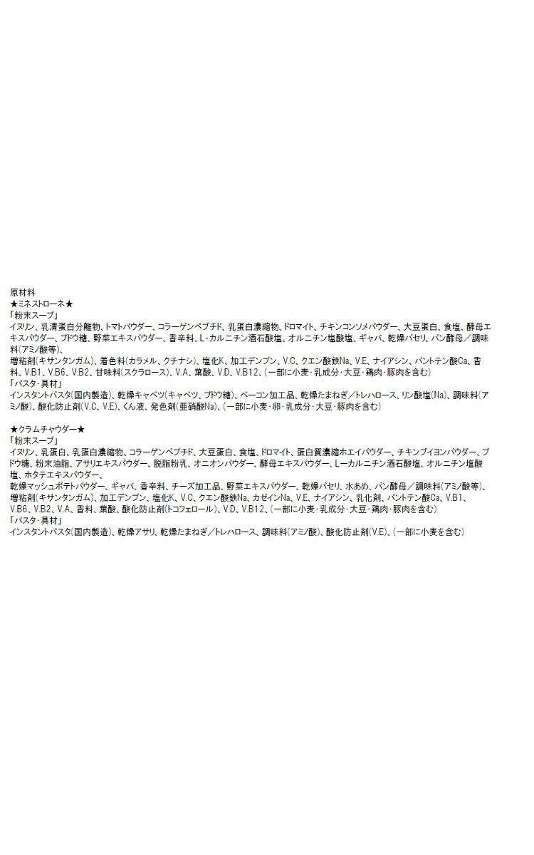 | 1食あたり※ (ミネストローネ) 熱量:183kcal、たんぱく質:18.5g、脂質:0.9g、炭水化物:30.5g(糖質:19.8g、食物繊維:10.7g)、食塩相当量:2.4g、亜鉛:2.9mg、カルシウム:308mg、鉄:3.6mg、銅:0.3mg、マグネシウム:167mg、ナイアシン:19mg、 パントテン酸:6.0mg、ビタミンA:821μg、ビタミンB1:1.3mg、ビタミンB2:1.2mg、ビタミンB6:1.2mg、ビタミンB12:3.3μg、ビタミンC:100mg、ビタミンD:5.0μg、ビタミンE:5.6mg、葉酸:224μg オルニチン塩酸塩:120mg、γ-アミノ酪酸(ギャバ):100mg、L-カルニチン:100mg、コラーゲン:3000mg カフェイン:0mg (クラムチャウダー) 熱量:168kcal、たんぱく質:17.9g、脂質:1.3g、炭水化物:26.6g(糖質:15.8g、食物繊維:10.8g)、食塩相当量:2.2g、亜鉛:2.9mg、カルシウム:406mg、鉄:3.6mg、銅:0.3mg、マグネシウム:167mg、ナイアシン:19mg、 パントテン酸:6.0mg、ビタミンA:821μg、ビタミンB1:1.3mg、ビタミンB2:1.2mg、ビタミンB6:1.2mg、ビタミンB12:5.1μg、ビタミンC:100mg、ビタミンD:5.0μg、ビタミンE:5.6mg、葉酸:224μg オルニチン塩酸塩:120mg、γ-アミノ酪酸(ギャバ):100mg、L-カルニチン:100mg、コラーゲン:3000mg カフェイン:0mg ※「1食あたり」とは、[ミネストローネ]粉末スープ37g、パスタ・具材20.4g/[クラムチャウダー]粉末スープ33g、パスタ・具材19.5gを指します。 |