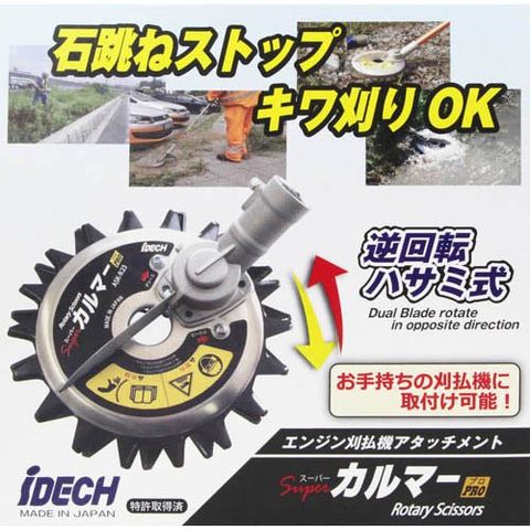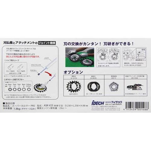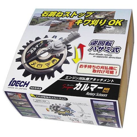 | サイズ:全長258×全幅230×全高101mm。 重量:1.8kg(ギアケース含む)。 外観:アルミ(A5052)。 減速方式(減速比):逆回転ギヤ減速(上刃1:18.8/下刃1:13.5)。 推奨刈払機エンジン:排気量23cc以上。 ★材質 外観:アルミ(A5052)。 カッター部:SKS5他。 |