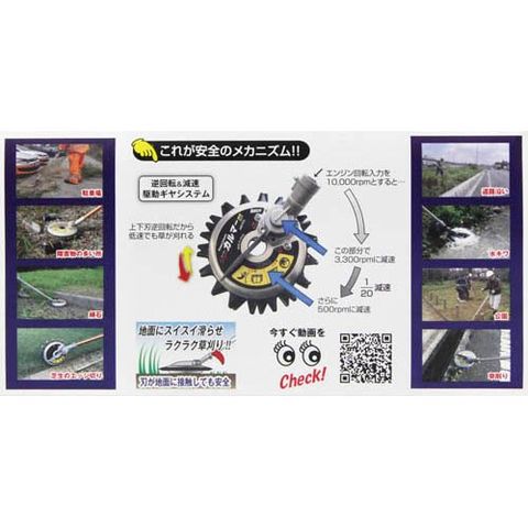 ●上下低速回転ハサミ刈り方式と簡易防水構造の実現で一枚刃と比べて水面への吸い込みやハネ返りがなく、水田のあぜ等の水際でも安全に草刈りができます。