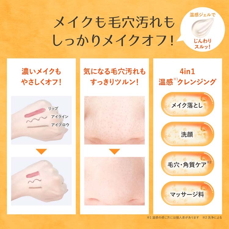 ●とろける「温感ジェル」がメイクや気になる毛穴汚れになじみ、やさしく落とします。