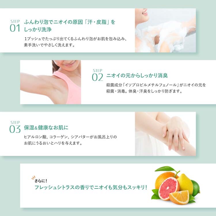 ポンプを押すとムース状になって出てきますので、適量を手またはやわらかいスポンジやタオル等にとり、全身をやさしく洗い、その後十分に洗い流してください。